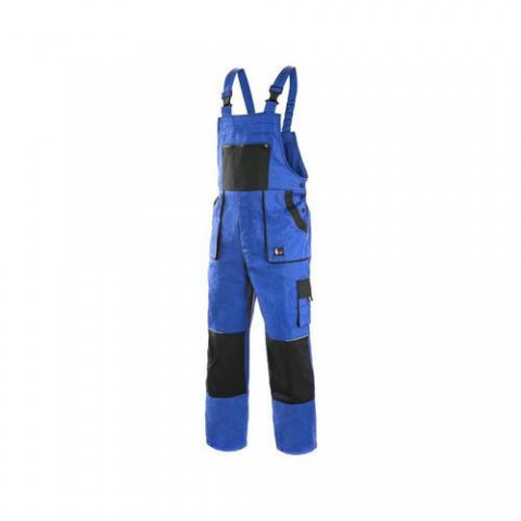 Modré zimní pánské montérky s laclem s černými doplňky. Zateplené flanelovou podšívkou ze 100% bavlny. Náprsní kapsa na zip, velké přední a menší boční kapsy schovají telefon, metr a další drobné předměty potřebné k práci. Zdvojená vyztužená partie kolen pomůže při častém klečení. Kšandy do gumy se zapínáním na plastovou přezku.Zimní pánské montérkové kalhoty CXS s laclem, modré/černé